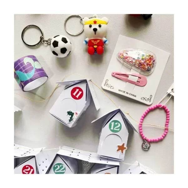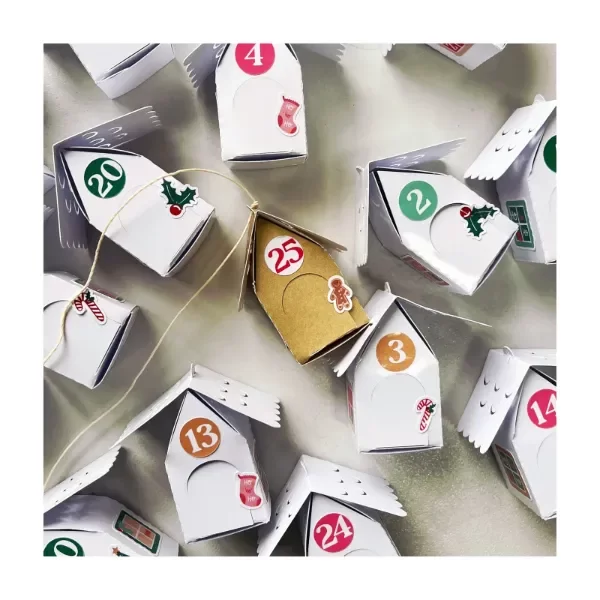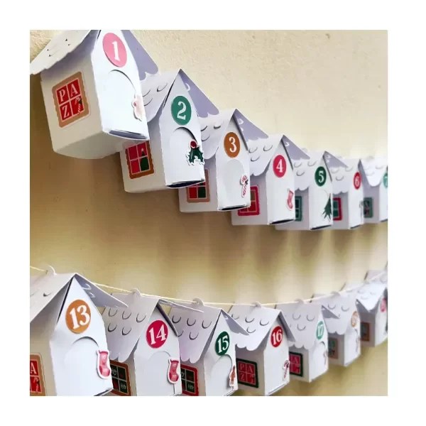 Contiene 2 planchas de Sticker / 25 Casitas para armar (medida 7cm de alto / 3,5 de ancho) / Hilo para colgar